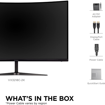 VX3218C-2K x1, 3-pin Plug (IEC C13 / CEE22) x1, DisplayPort Cable (v1.2; Male-Male) x1, AC/DC Adapter x1, Quick Start Guide x1